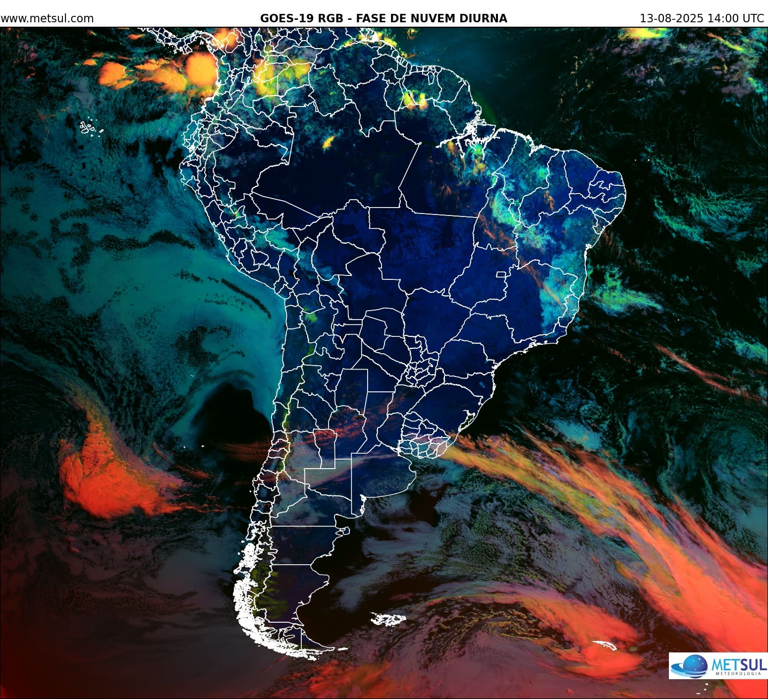 A imagem do satélite meteorológico GOES-19 da NOAA/NASA das 11h desta quarta-feira mostrava a frente fria se estendendo pelo Oceano Atlântico até o extremo Sul gaúcho, o Uruguai e a região do Rio da Prata com maior atividade sobre o oceano e escassa sobre o continente.