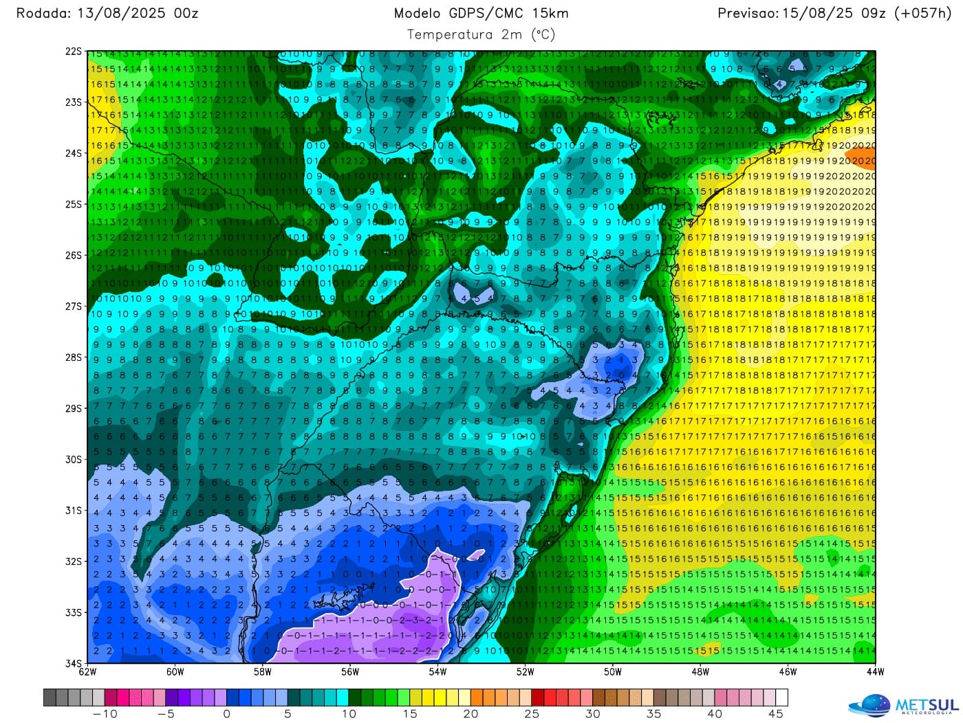 Não se projeta geada generalizada no Rio Grande do Sul pela menor potência desta massa de ar frio de trajetória marítima. A probabilidade de gear amanhã e na sexta-feira é maior em localidades da fronteira com o Uruguai, Campanha, Serra do Sudeste, Sul, baixadas do Planalto Médio e da Serra Gaúcha, e nos Campos de Cima da Serra.
