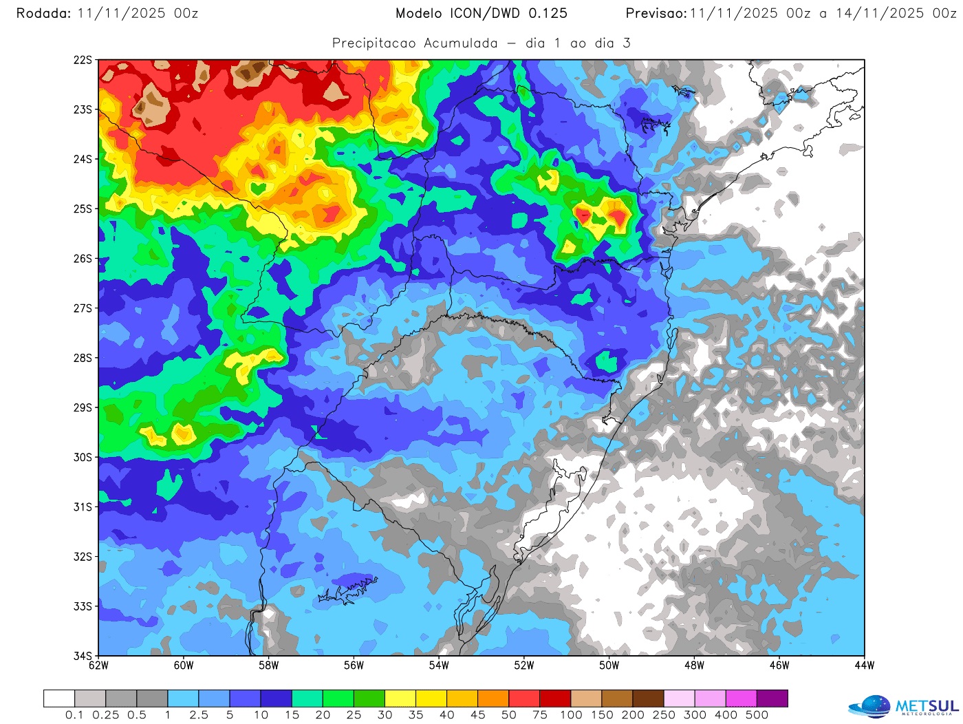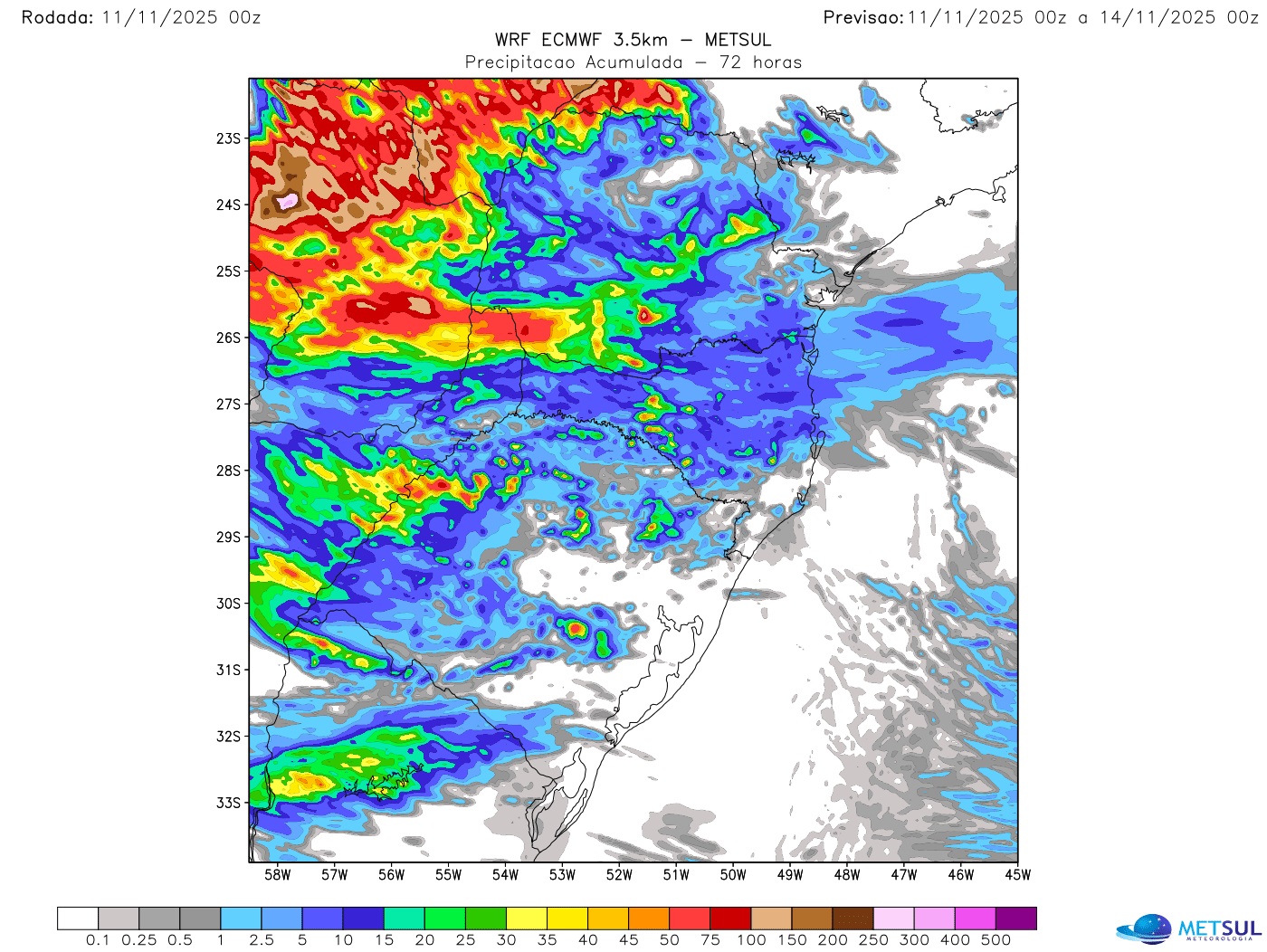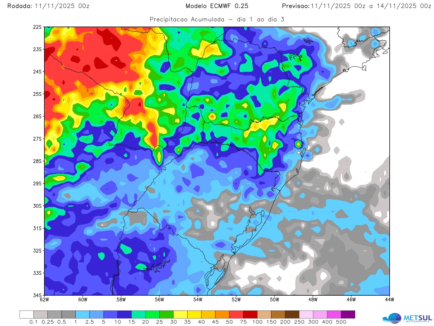 A MetSul Meteorologia destaca que a chuva será por demais irregular e mal distribuída no Sul do Brasil entre esta quarta e a quinta-feira com acumulados muito variáveis de um ponto para outro e predominantemente baixos na maioria das localidades onde chover.