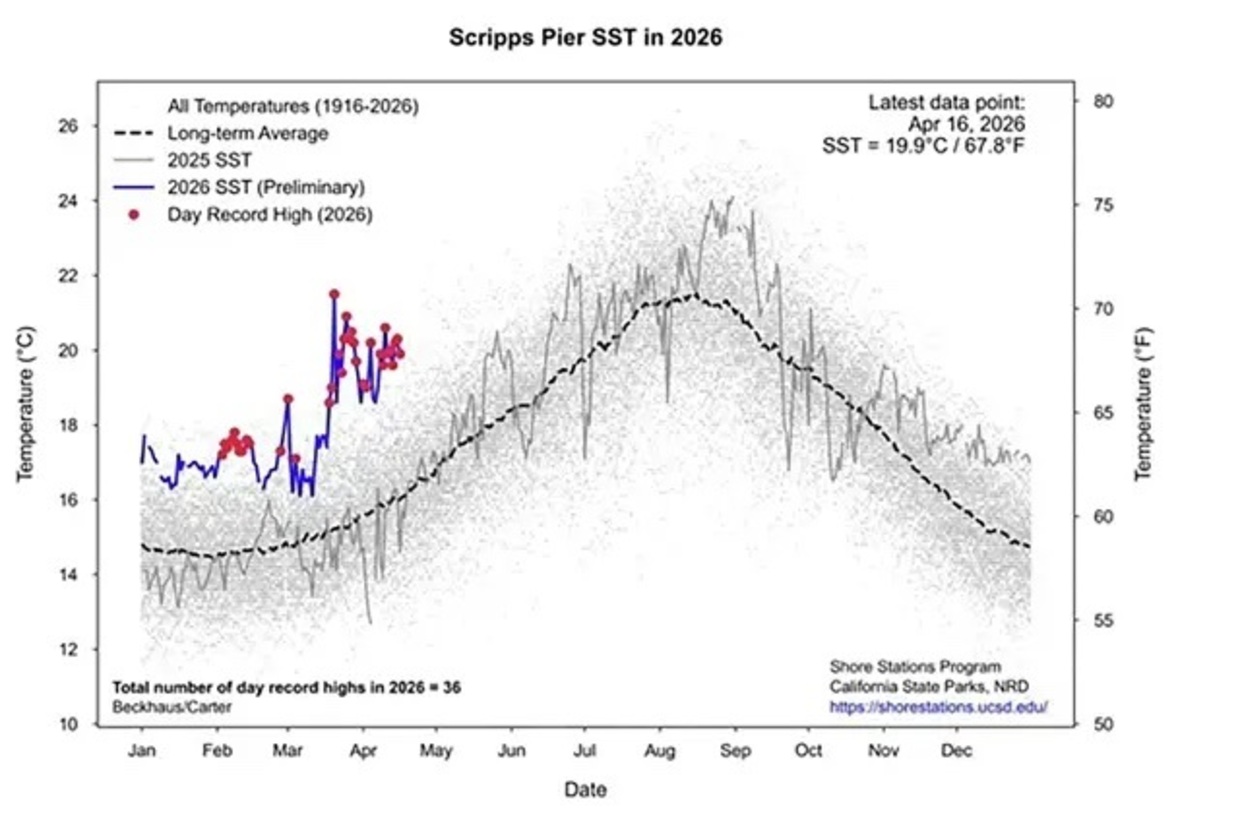 Instituições como a Scripps Institution of Oceanography registram sucessivos recordes diários de temperatura, alguns em séries históricas superiores a cem anos. Em algumas regiões, a água está tão quente quanto em episódios clássicos de El Niño já estabelecido.