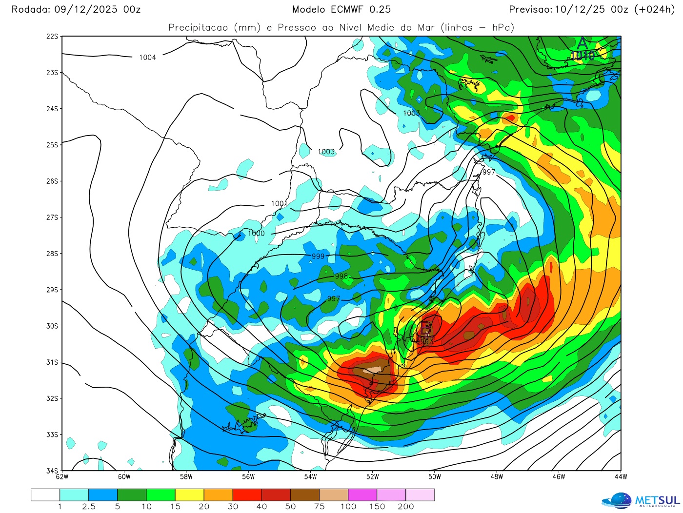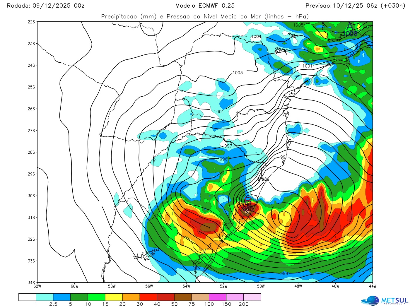 Modelo europeu indica pressão de 985 hPa no centro do ciclone hoje à noite no Norte da Lagoa dos Patos. Para o começo da quarta, aponta pressão de apenas 982 hPa com o centro do sistema muito perto da costa, logo a Leste da parte mais Sul do Litoral Norte gaúcho.