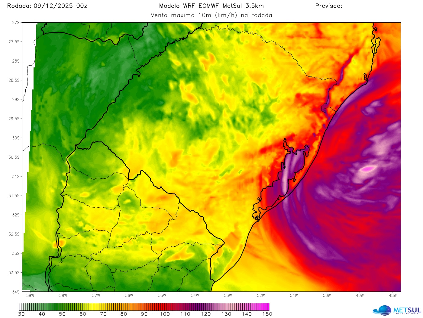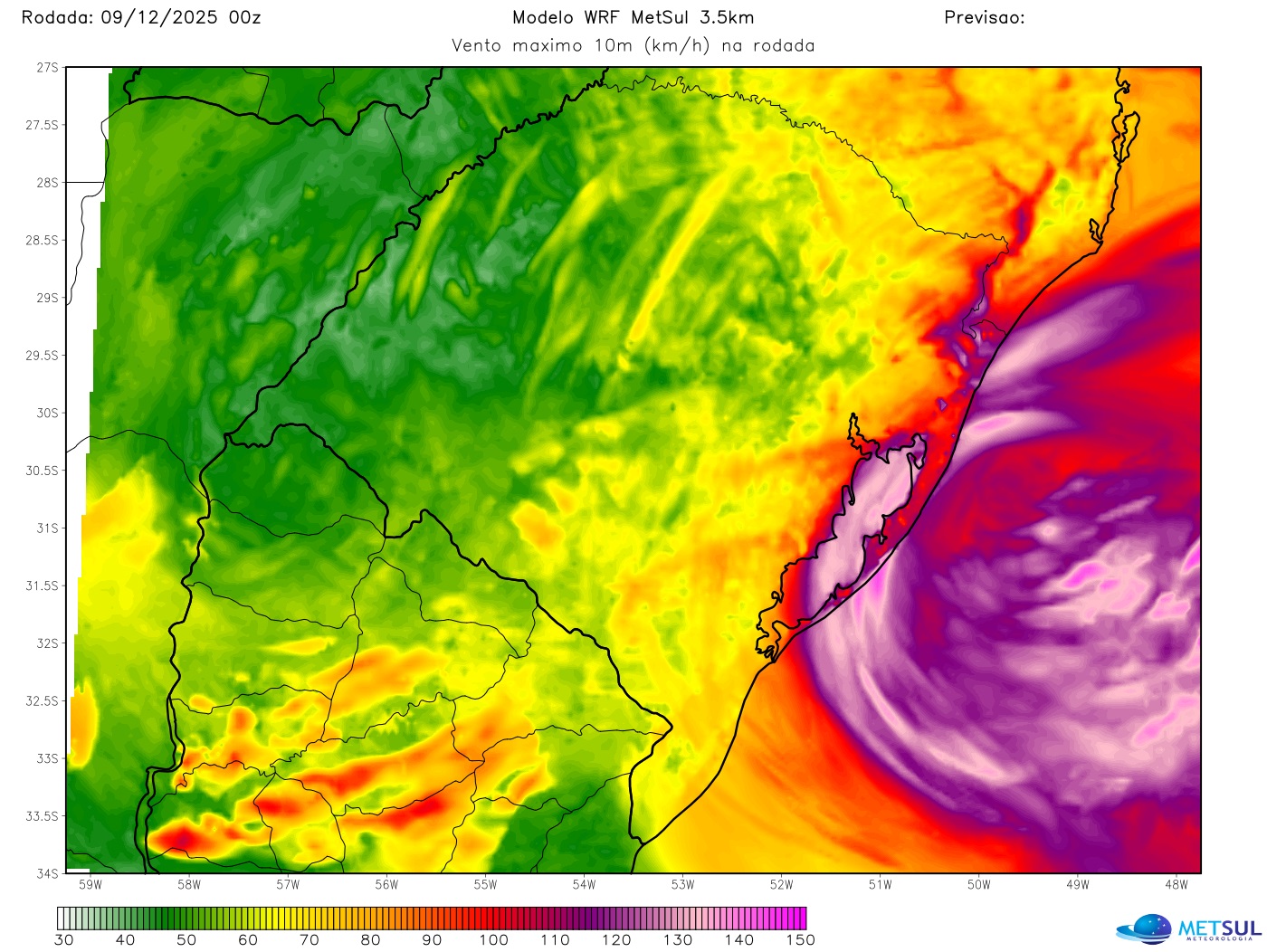 Conforme os mais recentes dados dos modelos, que estão em relativo acordo, as áreas de maior risco de vento intenso perto e acima de 100 km/h incluem as águas abertas da Lagoa dos Patos e municípios costeiros do Litoral Médio, especialmente a região de Mostardas.