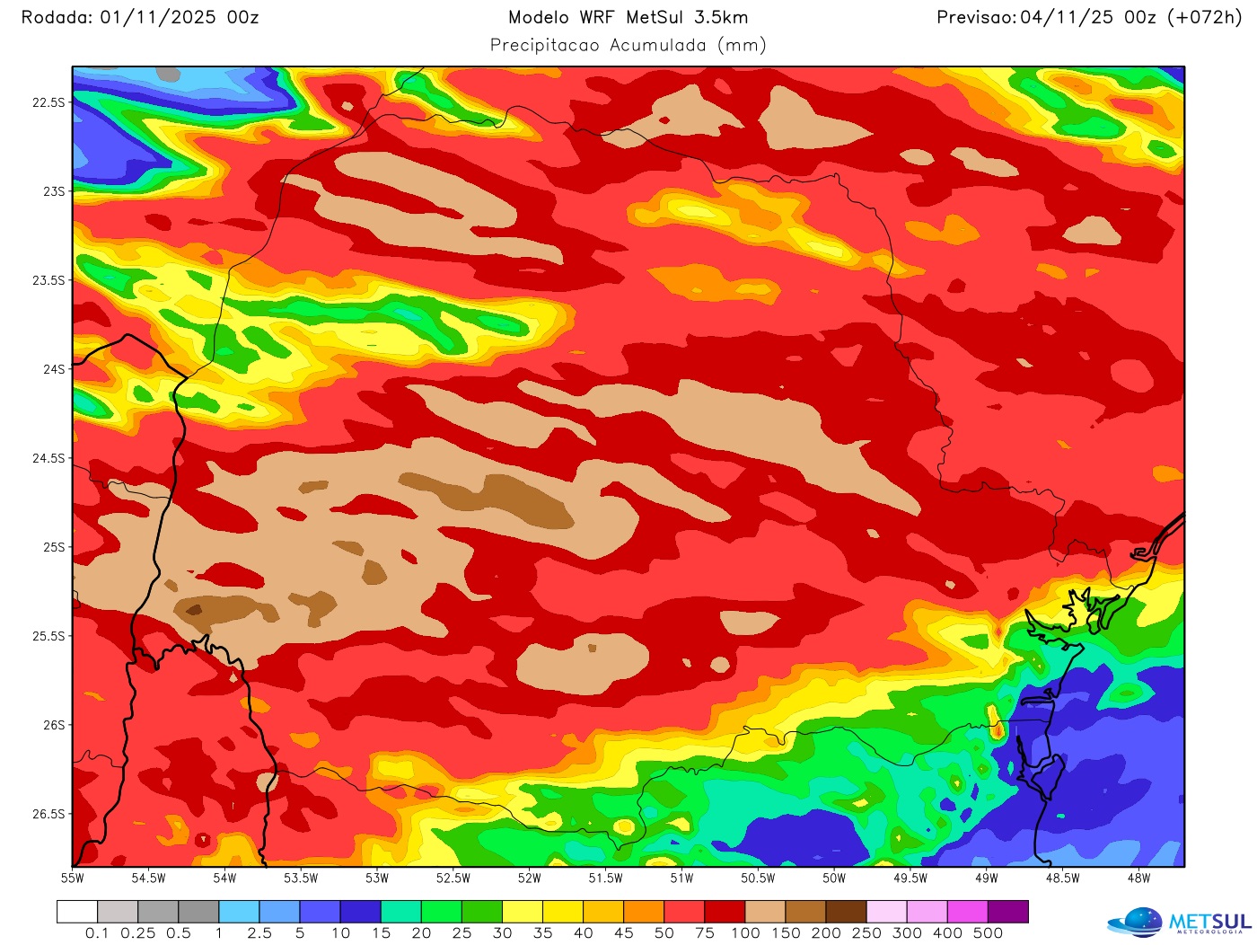 O modelo de alta resolução chega a indicar a possibilidade de acumulados pontuais de até 150 mm ou mais, ou seja, alguns municípios paranaenses podem ter apenas nestes dois primeiros dias de novembro quase a média de chuva do mês inteiro.