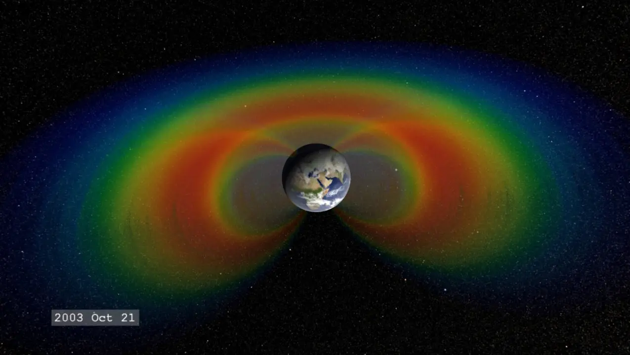 O Sol expele um fluxo constante de partículas e campos magnéticos conhecidos como vento solar e vastas nuvens de plasma quente e radiação chamadas ejeções de massa coronal. Quando esse material solar flui pelo espaço e atinge a magnetosfera da Terra, o espaço ocupado pelo campo magnético da Terra, ele pode ficar preso e preso em dois cinturões em forma de rosquinha ao redor do planeta chamados Cinturões de Van Allen.
