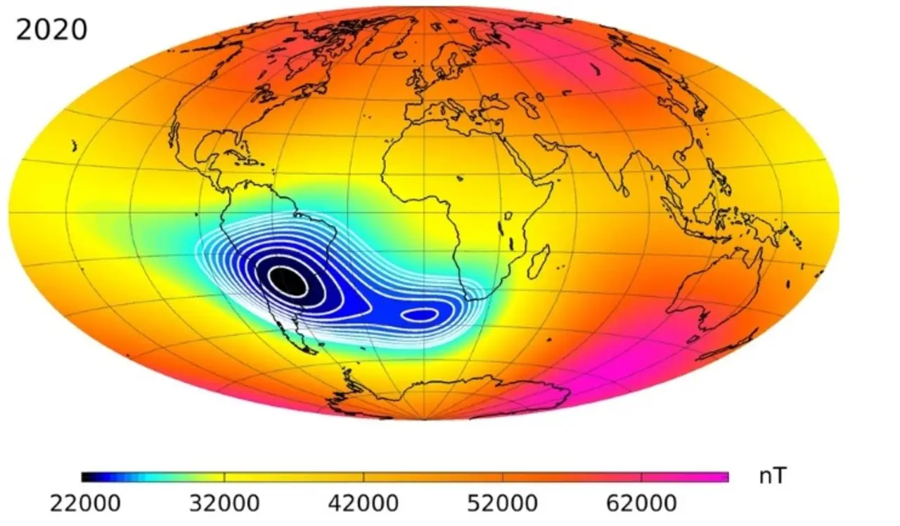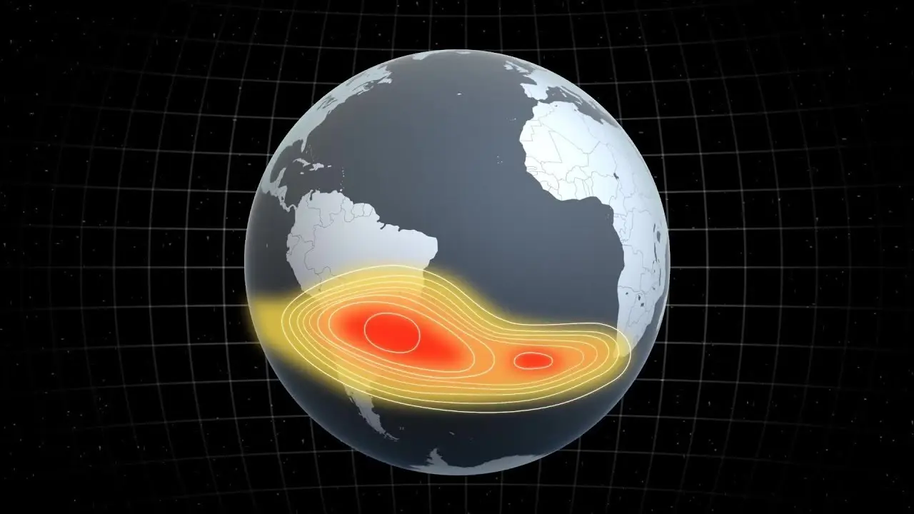 O campo magnético da Terra atua como um escudo protetor ao redor do planeta, repelindo e prendendo partículas carregadas do Sol. Ocorre que sobre a América do Sul e o Sul do Oceano Atlântico, um ponto extraordinariamente fraco no campo – chamado de Anomalia do Atlântico Sul, permite que essas partículas mergulhem mais perto da superfície do que o normal.