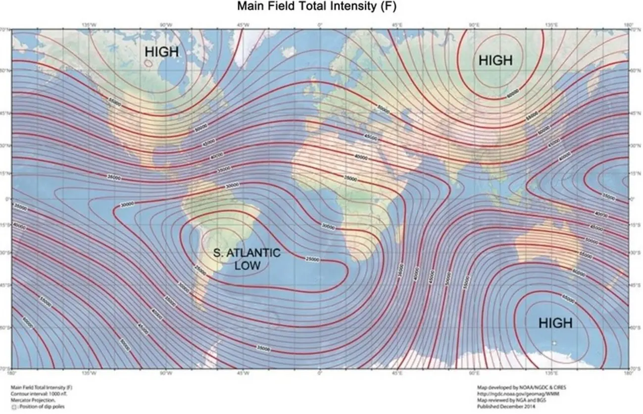 As forças no núcleo e a inclinação do eixo magnético juntas produzem a anomalia, a área de magnetismo mais fraco, permitindo que partículas carregadas presas no campo magnético da Terra mergulhem mais perto da superfície.