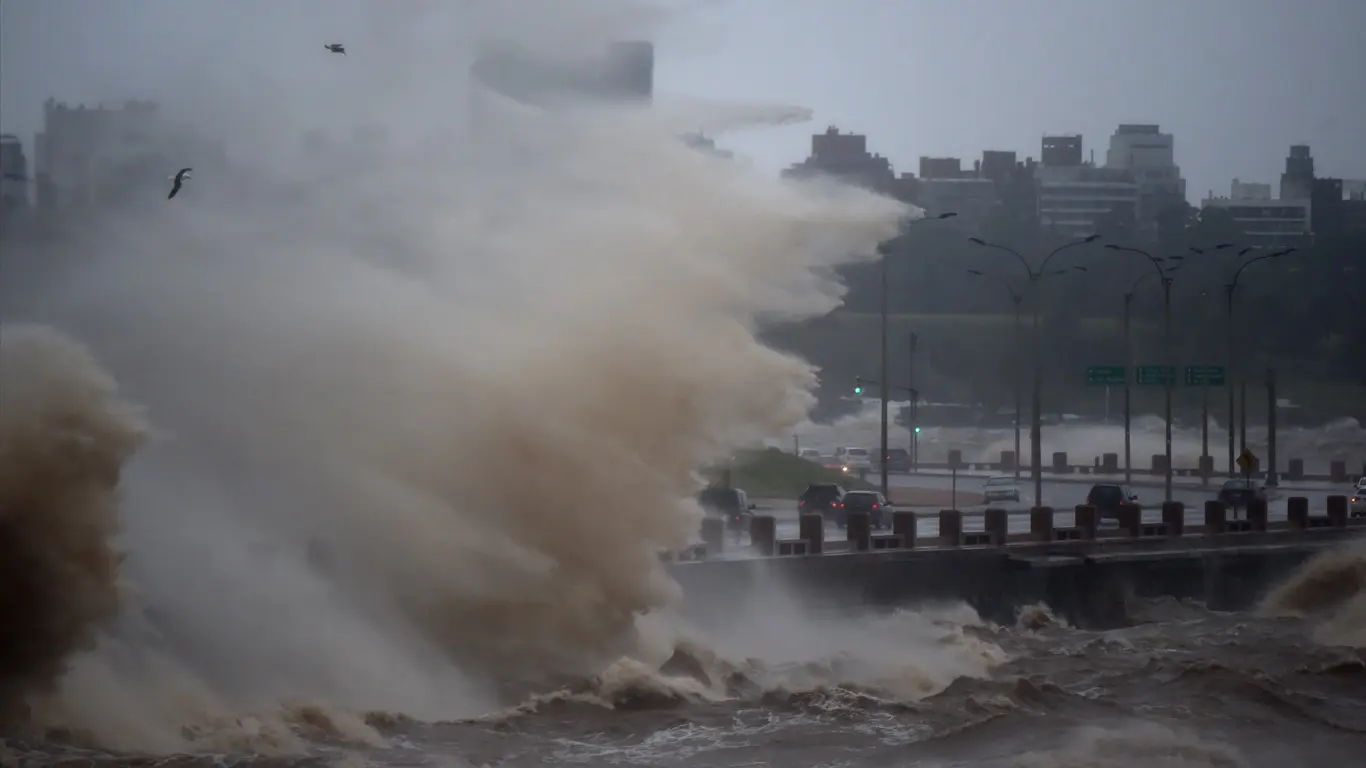 Ciclones extratropicais se formam mais frequentemente na costa da Argentina e junto ao Rio da Prata, as duas principais regiões ciclogenéticas (de formação de ciclones) na América do Sul. Montevidéu (em foto da tempestade Yakecan de 17 de maio de 2022) sofre com frequência com ciclones. O pior ocorreu em agosto de 2005. | PABLO PORCIUNCULA/AFP/METSUL METEOROLOGIA