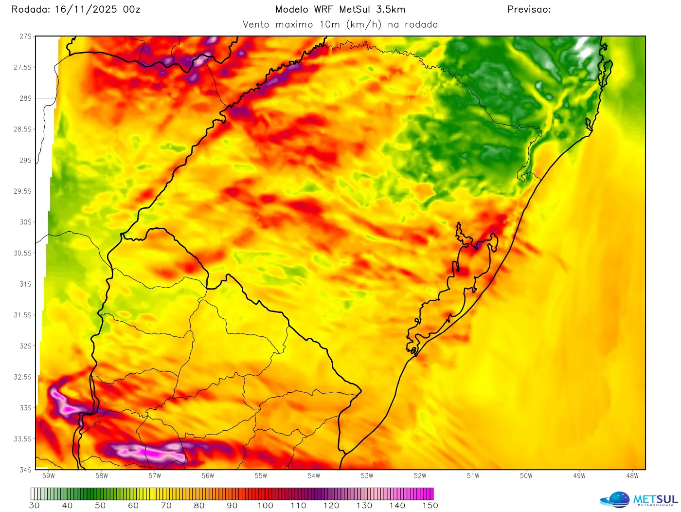 Uma preocupação é vento. A frente fria deve alcançar Porto Alegre perto da hora mais quente do dia e em um domingo com temperatura muito altas em que as máximas podem ficar na região entre 33ºC e 35ºC. Isso agrava sobremaneira o risco de vento forte, especialmente considerando que a instabilidade deve avançar em forma de linha.