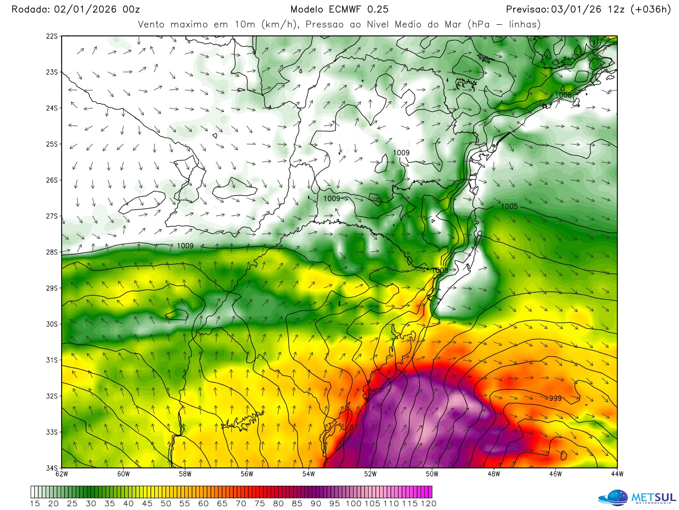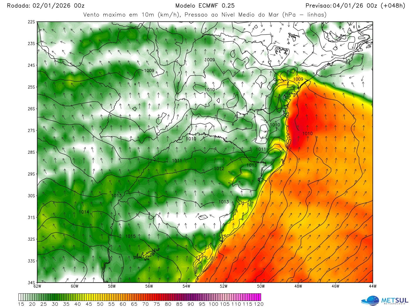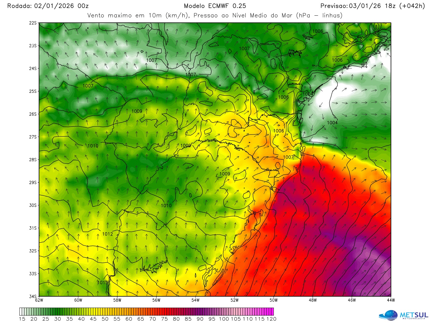 No Litoral Norte, as rajadas devem ficar em média entre 60 km/h e 70 km/h, mas podem ser superiores em alguns pontos. No Litoral Sul gaúcho, o vento pode ser mais forte com rajadas de 70 km/h a 80 km/h, porém isoladamente superiores.