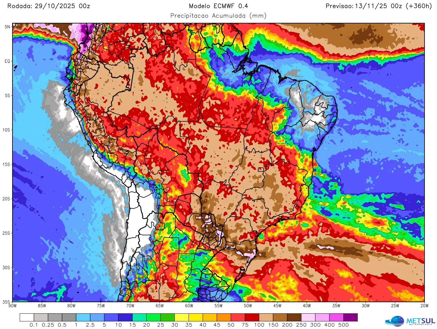 A MetSul Meteorologia projeta o começo da estação chuvosa com chuva mais regular e volumosa no Centro do Brasil nos próximos 15 dias com acumulados altos em diversos estados e que localmente poderão provocar até transtornos.