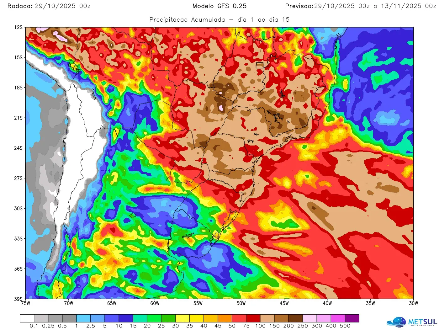 Já o mapa acima mostra a projeção de chuva para 15 dias do modelo GFS da NOAA dos Estados Unidos em que se observa igual tendência de chover muito no Sul, Centro-Oeste e o Sudeste do país.