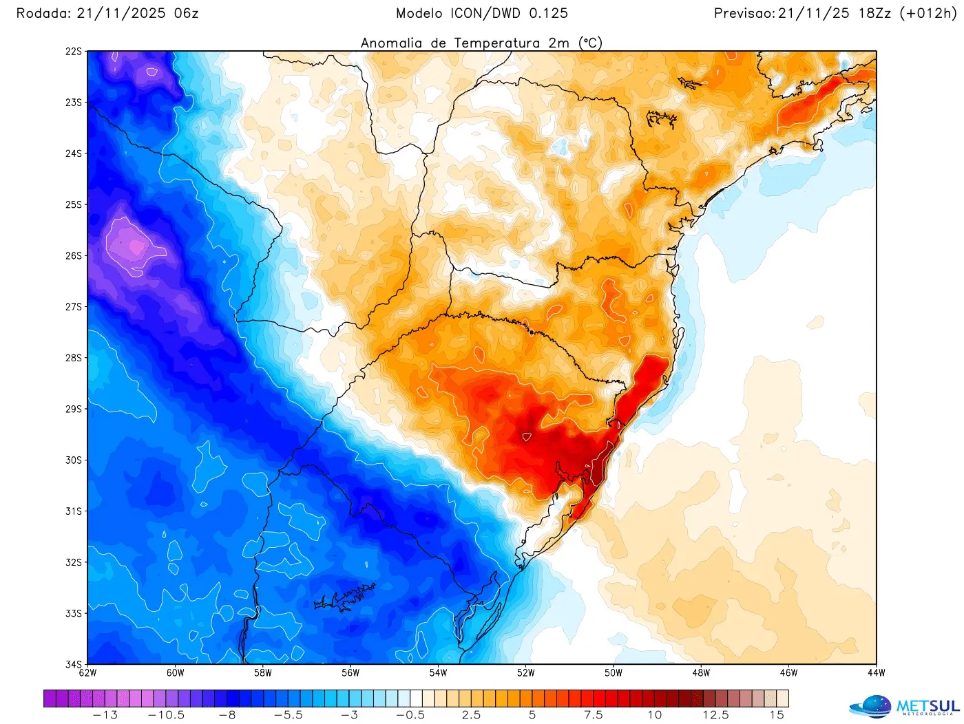 O mapa abaixo mostra a projeção de anomalia de temperatura (desvio da média desta época do ano) a partir de dados do modelo Icon em que se observa o grande contraste térmico no Rio Grande do Sul.