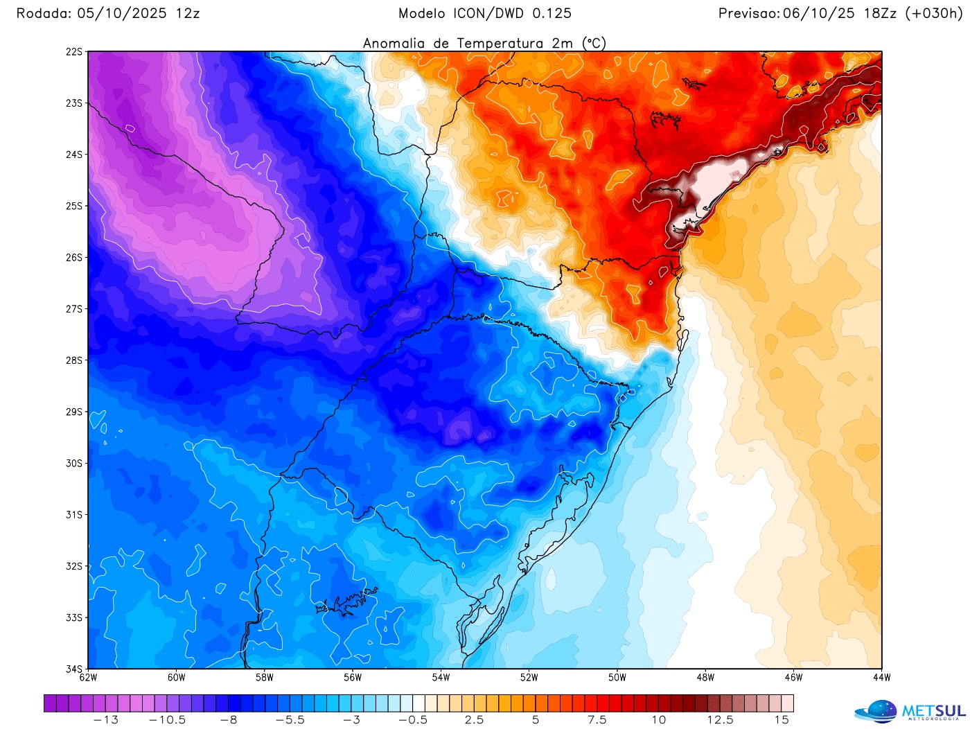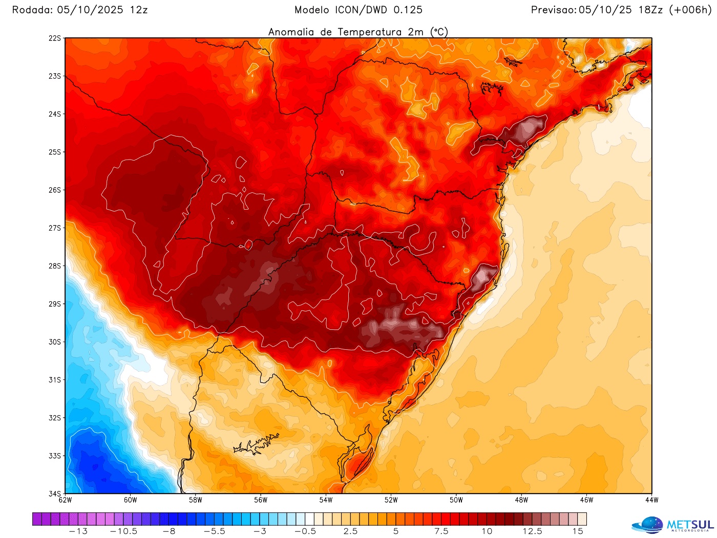 Mapa de anomalia de temperatura (desvio da média histórica) na tarde deste domingo no Sul do Brasil com dados do modelo meteorológico alemão Icon | METSUL