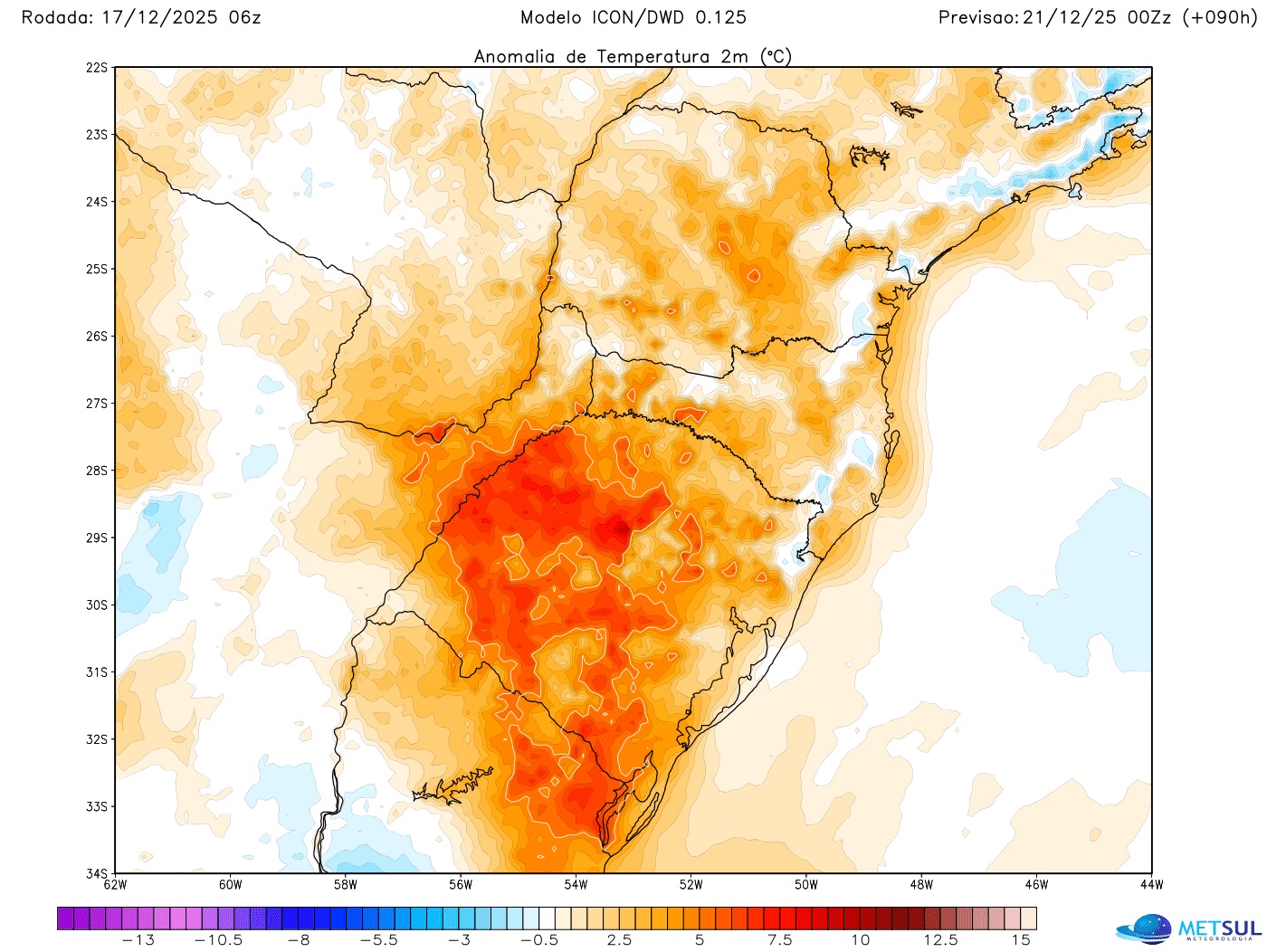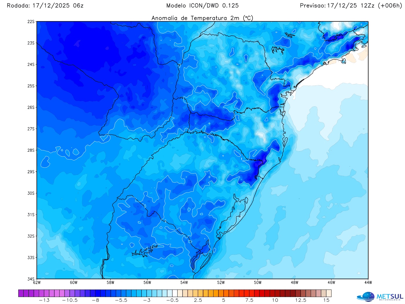 Mapa de anomalia de temperatura (desvio da média histórica) do modelo meteorológico alemão Icon da manhã desta quarta-feira (17) | METSUL