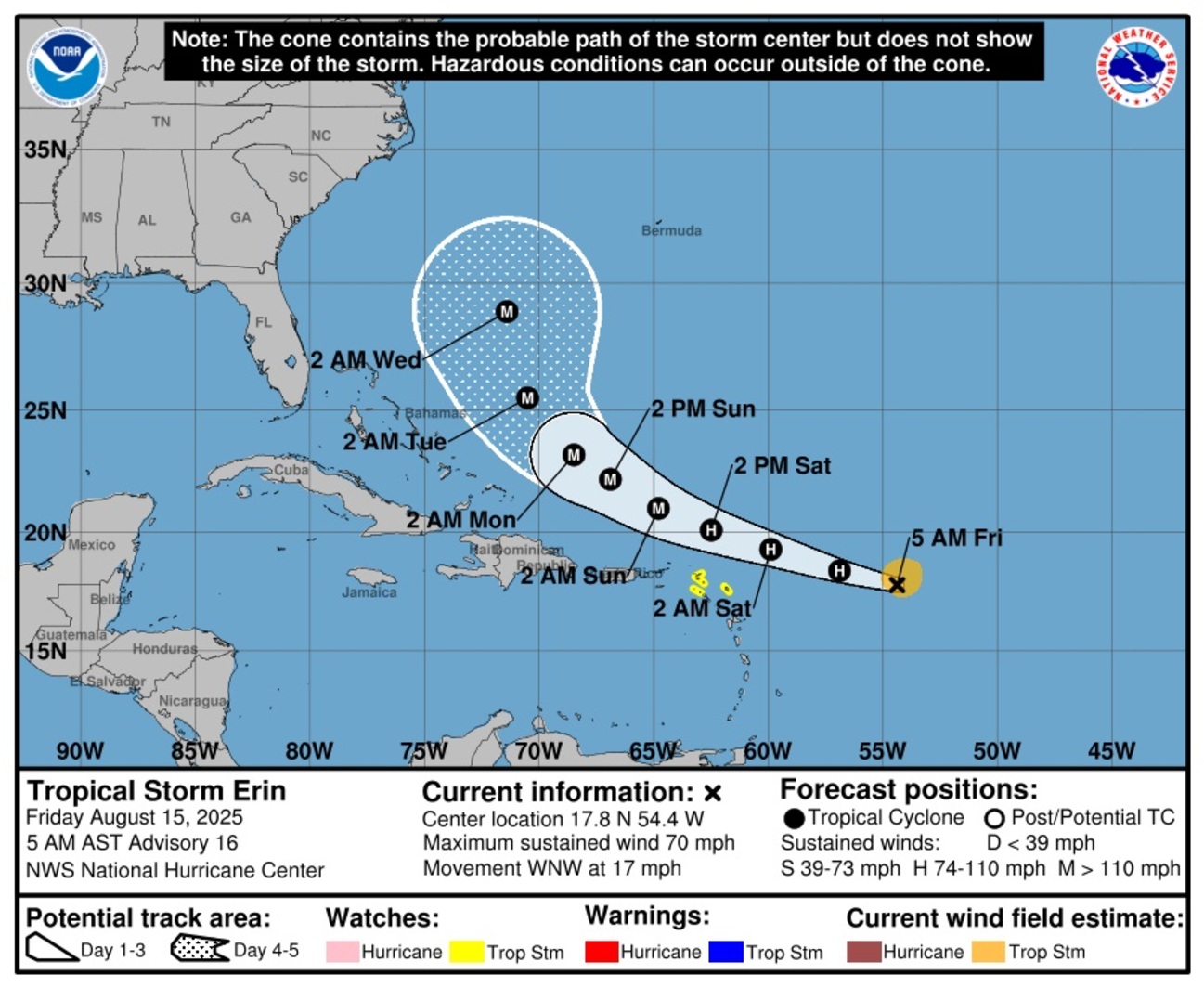 O Centro Nacional de Furacões (NHC) informou que os ventos de Erin chegaram a 110 km/h, com previsão de intensificação. A expectativa é que o sistema alcance a categoria de furacão nesta sexta-feira e possa chegar a grande furacão (categoria 3 ou mais) no fim de semana.