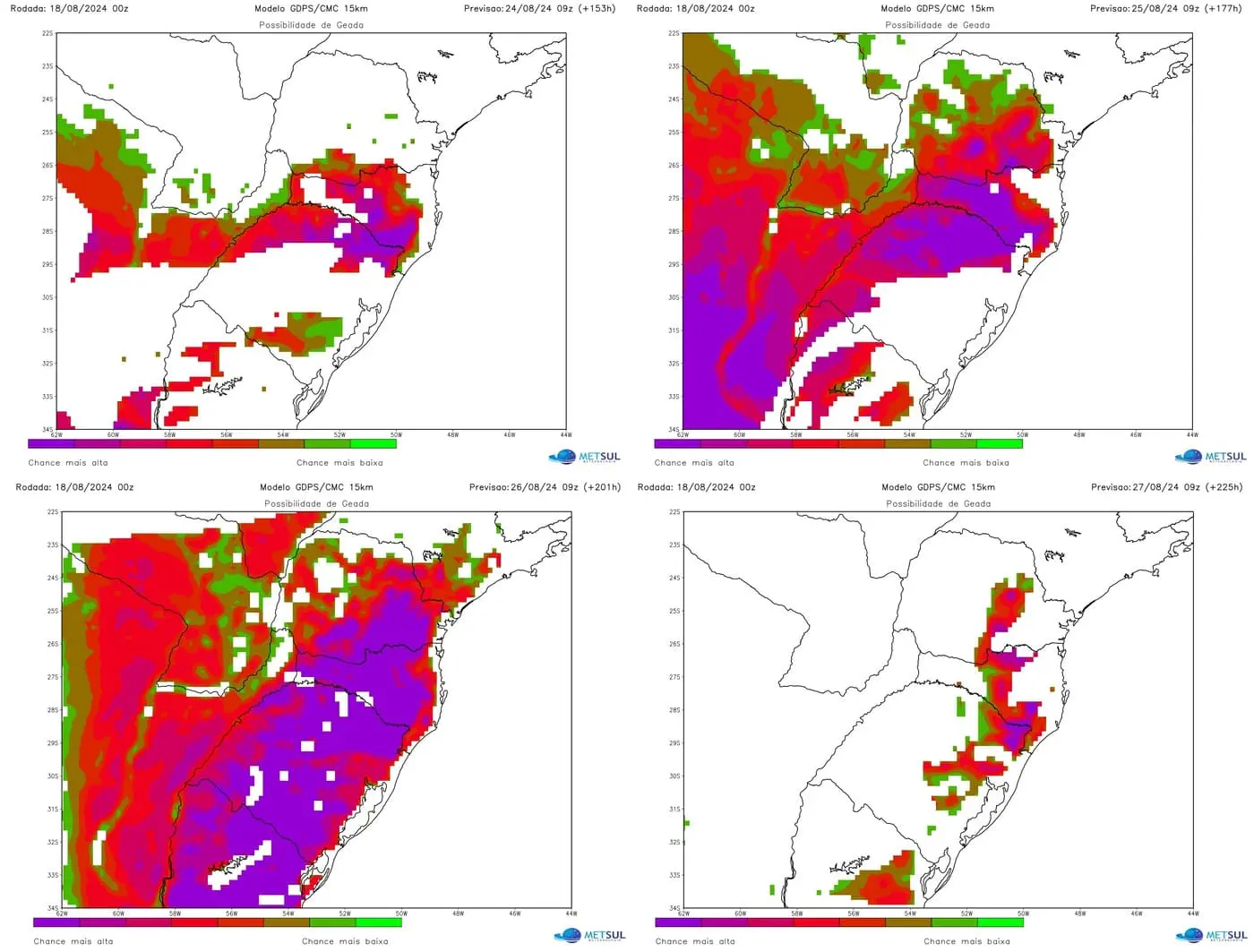 Os mapas abaixo mostram a probabilidade de formação de geada ao amanhecer para os dias 24 a 27 de agosto, de acordo com dados do modelo canadense, em que se observa como a segunda (26) deve ser o dia com chance de geada mais ampla.