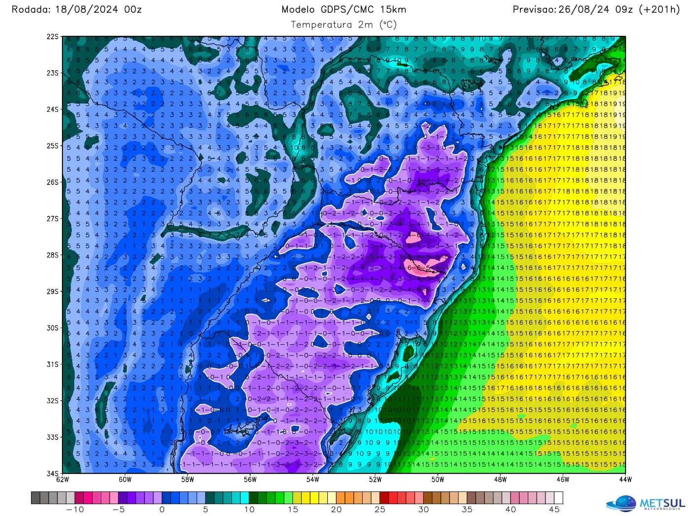 Dados indicam neste momento que grande número de cidades do Sul do Brasil poderá ter marcas perto ou abaixo de 0ºC no próximo fim de semana e início da semana que vem. Nas áreas de maior altitude do Rio Grande do Sul e Santa Catarina, como no Planalto Sul Catarinense e Aparados da Serra, os modelos projetam hoje mínimas de 3ºC a 5ºC abaixo de zero.