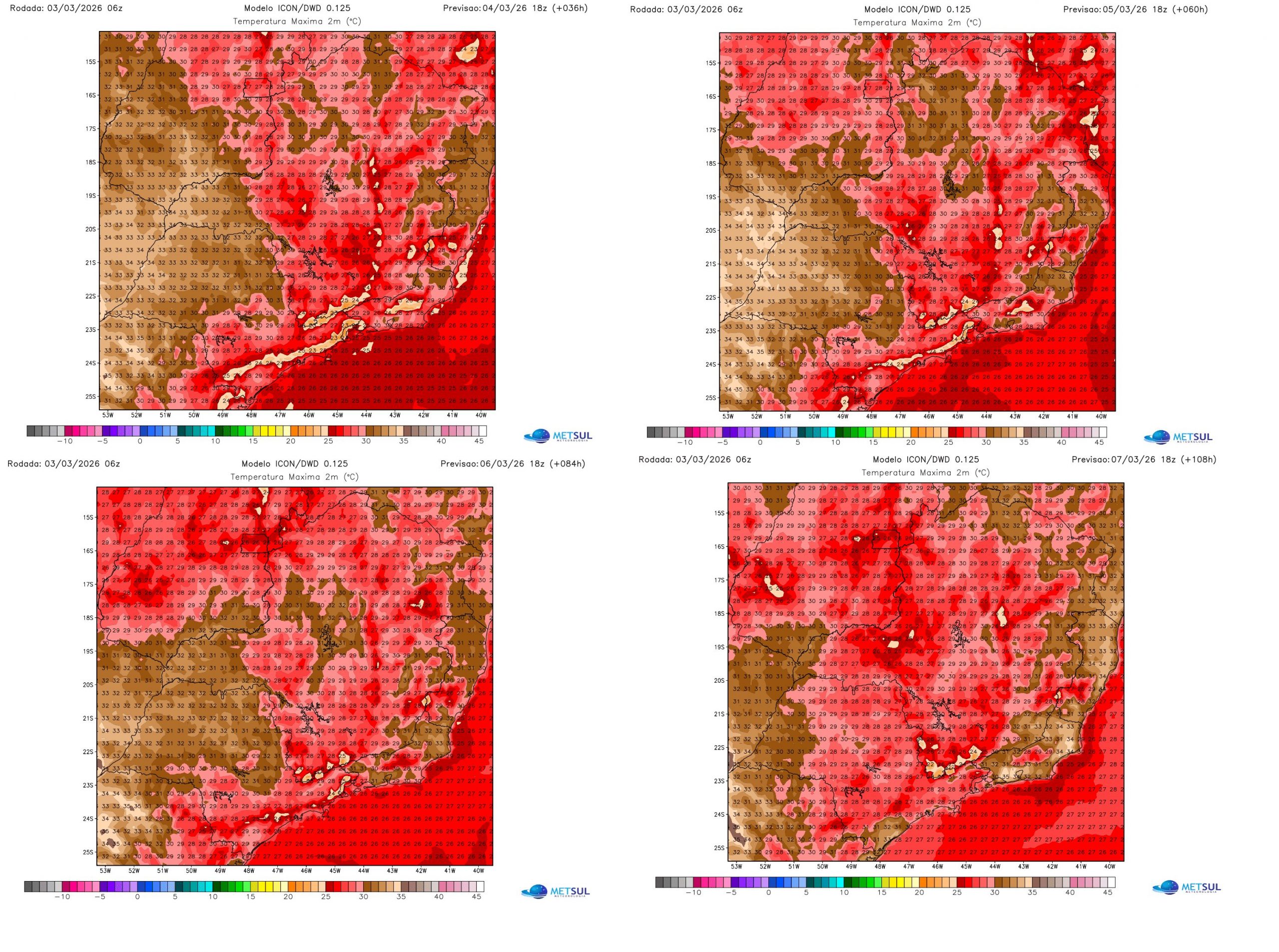 Nesse contexto a sequência de mapas de projeção de temperatura máxima do modelo ICON alemão indica que o pico de aquecimento deverá ocorrer nas tardes desta quarta e quinta. As máximas no Oeste poderão passar de 35°C. Na grande maioria dos municípios do Centro, Oeste e Norte as máximas irão oscilar entre 31 e 33°C.