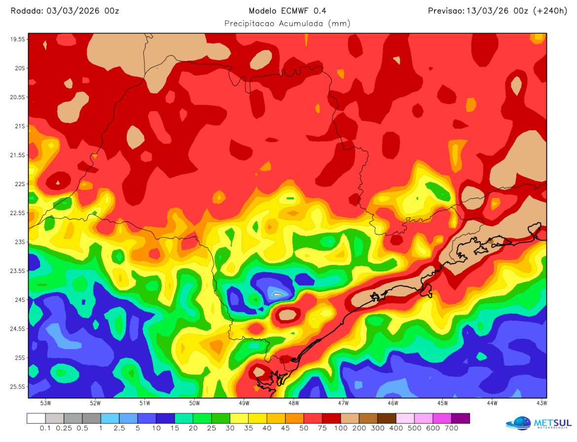 Hoje modelos projetam que entre a noite de segunda e as primeiras horas da terça-feira, dia 10, será um dia de alto risco para o leste paulista, sobretudo, a faixa litorânea e o vale do Paraíba com risco de excessos de chuva. Se esse cenário se confirmar há risco de alagamentos e deslizamentos de terra. No mapa abaixo o modelo europeu projeta entre 100 e 200 mm entre a baixada Santista e o litoral norte, bem como, no Noroeste do estado na divisa com o triângulo mineiro.