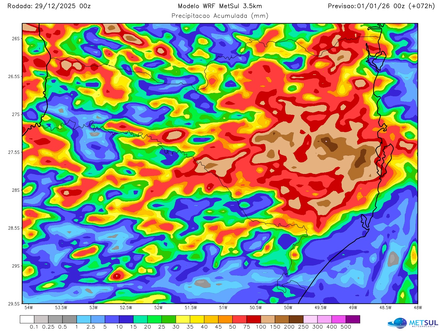 A MetSul Meteorologia alerta para condições favoráveis à chuva localmente forte a intensa com volumes localizados muito altos em curtos intervalos em Santa Catarina no final deste ano.