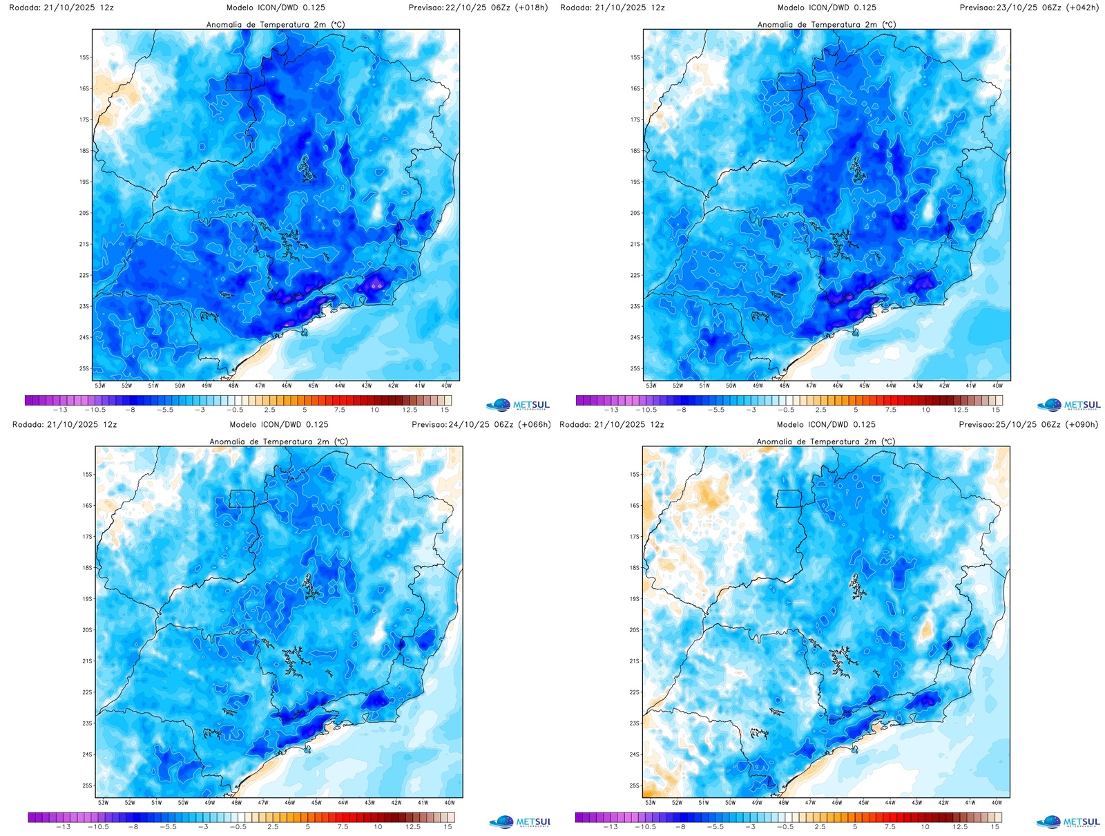 Os mapas abaixo mostram as projeções de anomalia de temperatura (desvio da média) do modelo meteorológico alemão Icon para o Sudeste do Brasil nas madrugadas desta quarta, quinta, sexta e o sábado.