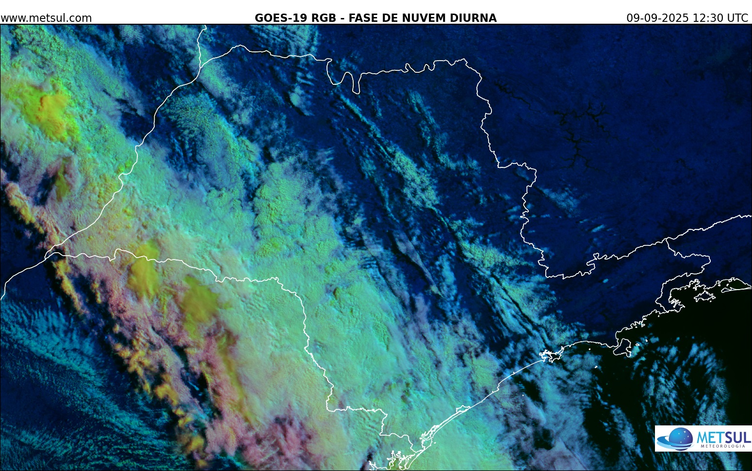 A imagem do satélite meteorológico GOES-19 da NOAA/NASA da manhã desta terça-feira (acima) mostrava o sistema frontal avançando pelo estado de São Paulo com aumento de nuvens, embora o sol ainda aparecesse em diversas localidades, especialmente em localidades próximas do Rio de Janeiro e Minas Gerais.