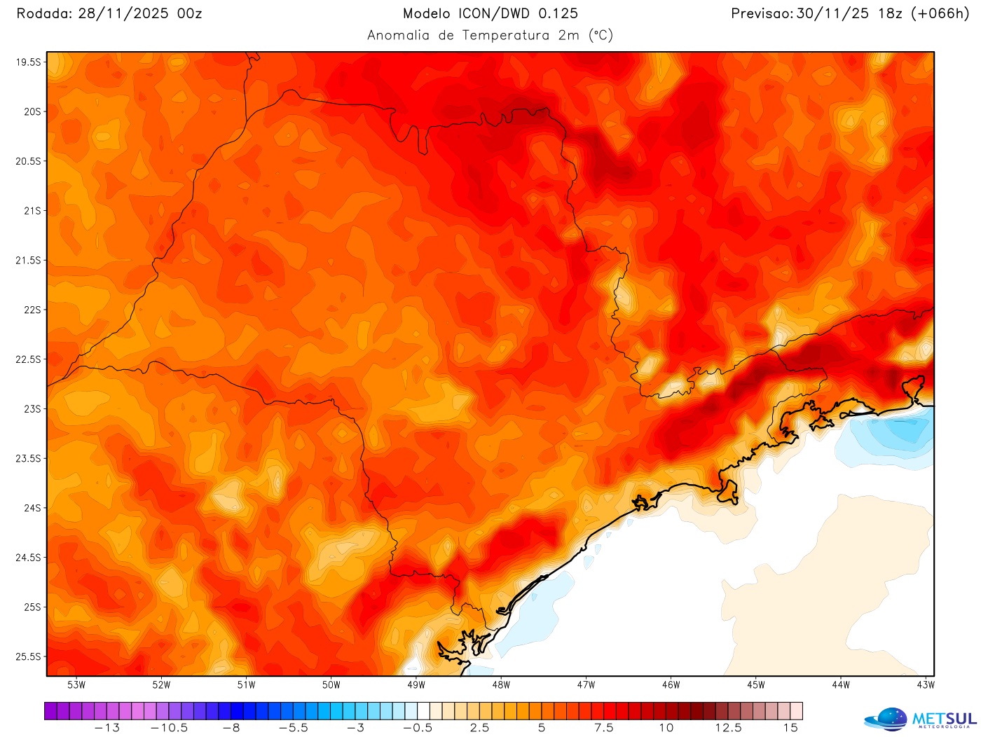 Mapa de anomalia de temperatura indica marcas muito acima da média em todo o estado de São Paulo | METSUL