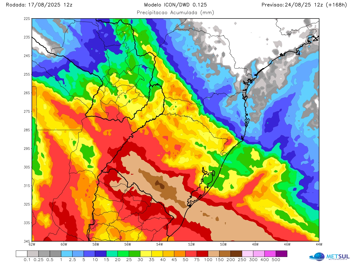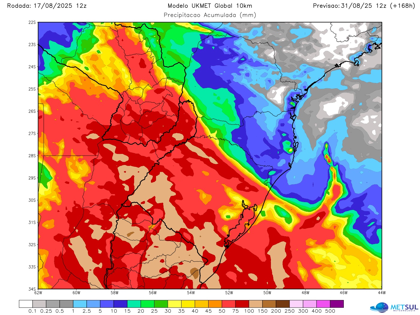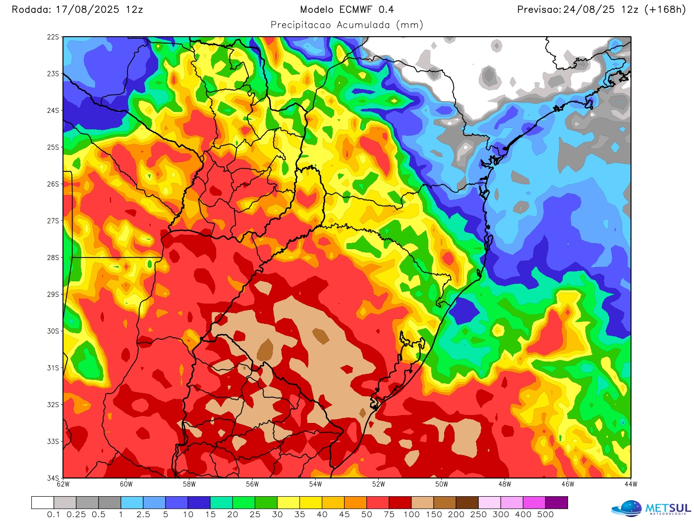 Como se observa nos mapas, os dados indicam a possibilidade de volumes de 100 mm a 150 mm em diversos pontos do Oeste e do Sul do Rio Grande do Sul, mas há modelos apontando a possibilidade de acumulados até perto e acima dos 200 mm.