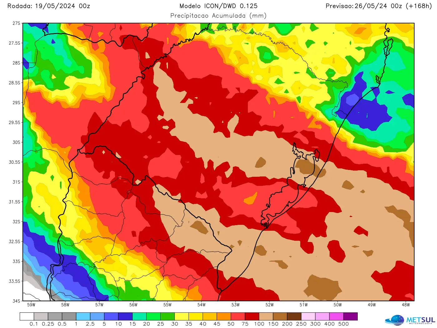Como se observa, a chuva atingirá todas as regiões e parte do estado pode ter marcas na semana perto e acima de 100 mm. Os volumes podem ser altos no Sul do estado, que enfrenta enchente da Lagoa dos Patos, e na região de Porto Alegre, que amarga há semanas a cheia do Guaíba.