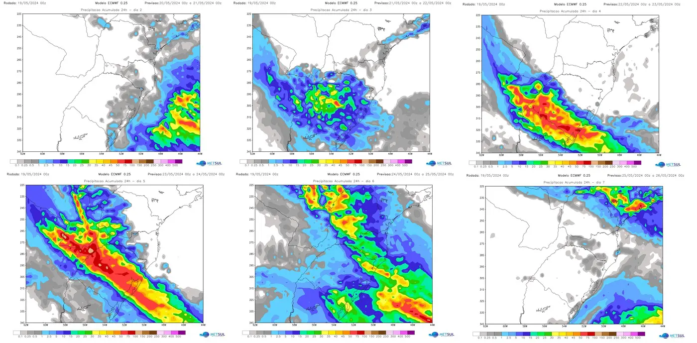 Os mapas abaixo mostram a projeção de chuva acumulada no Sul do Brasil dia a dia entre esta segunda-feira e o sábado, de acordo com a rodada da 0Z deste domingo do modelo do Centro Meteorológico do Centro Europeu (ECMWF).