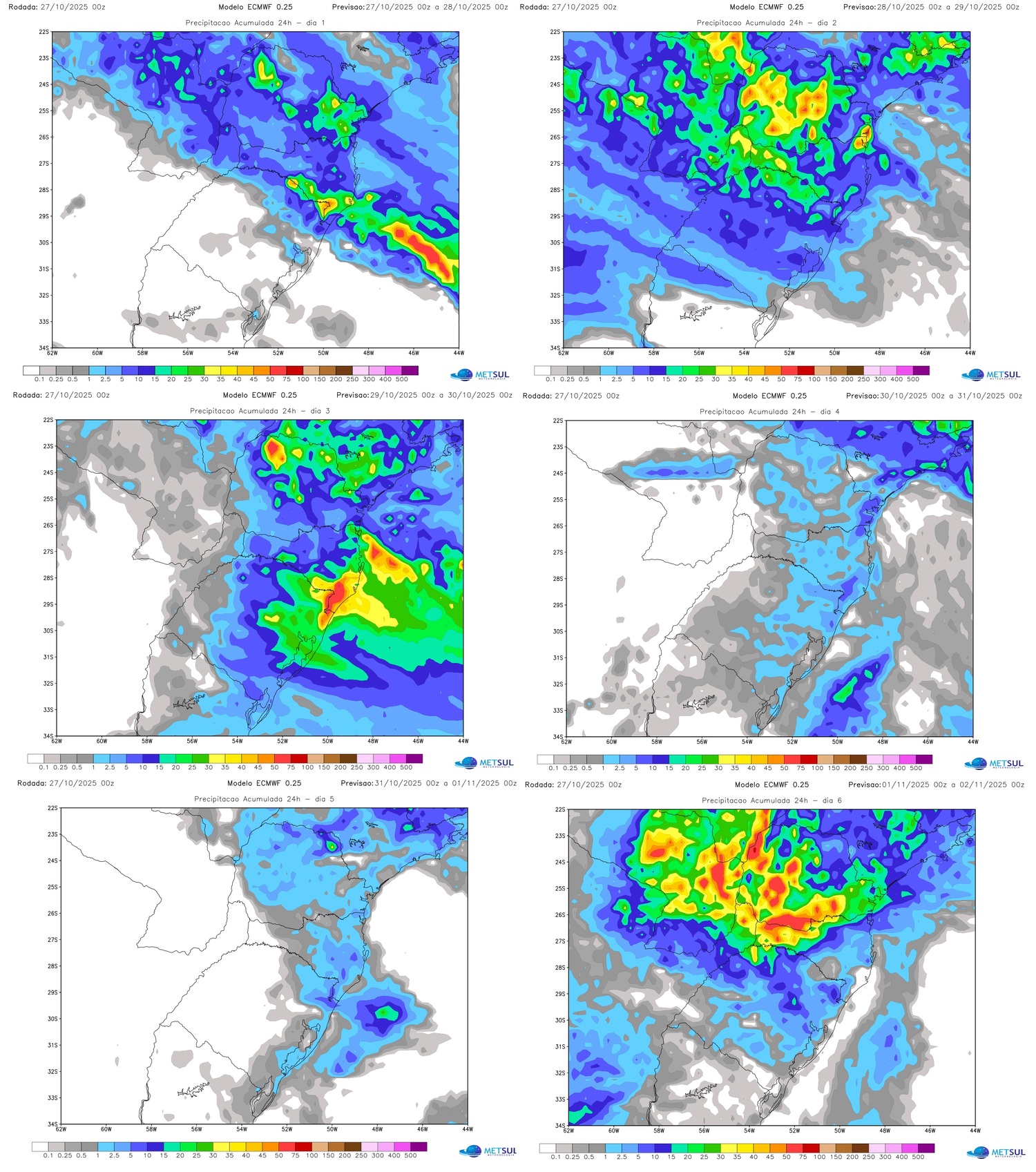 Os mapas a seguir mostram a projeção de chuva dia a dia entre hoje e o sábado no Sul do Brasil a partir de dados do modelo do Centro Meteorológico Europeu, disponível para consulta a qualquer hora para o nosso assinante (assine aqui).