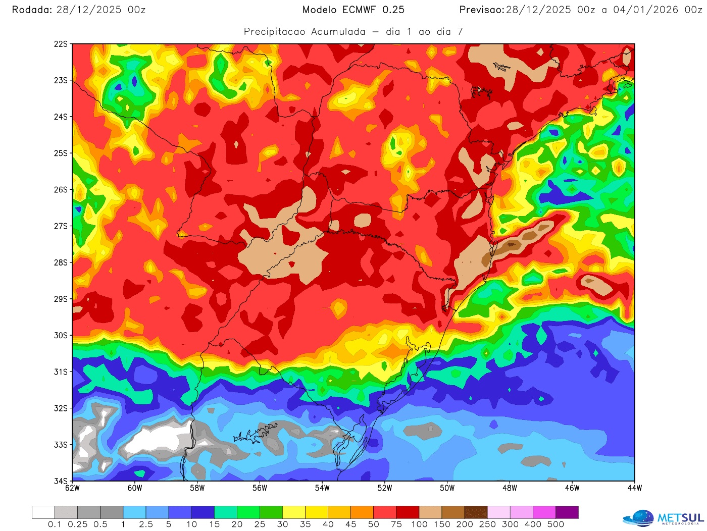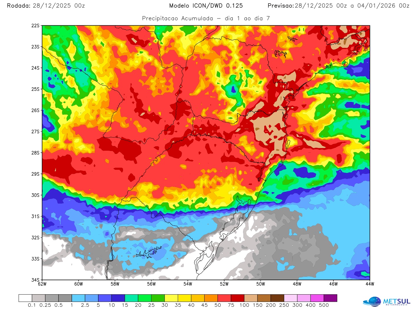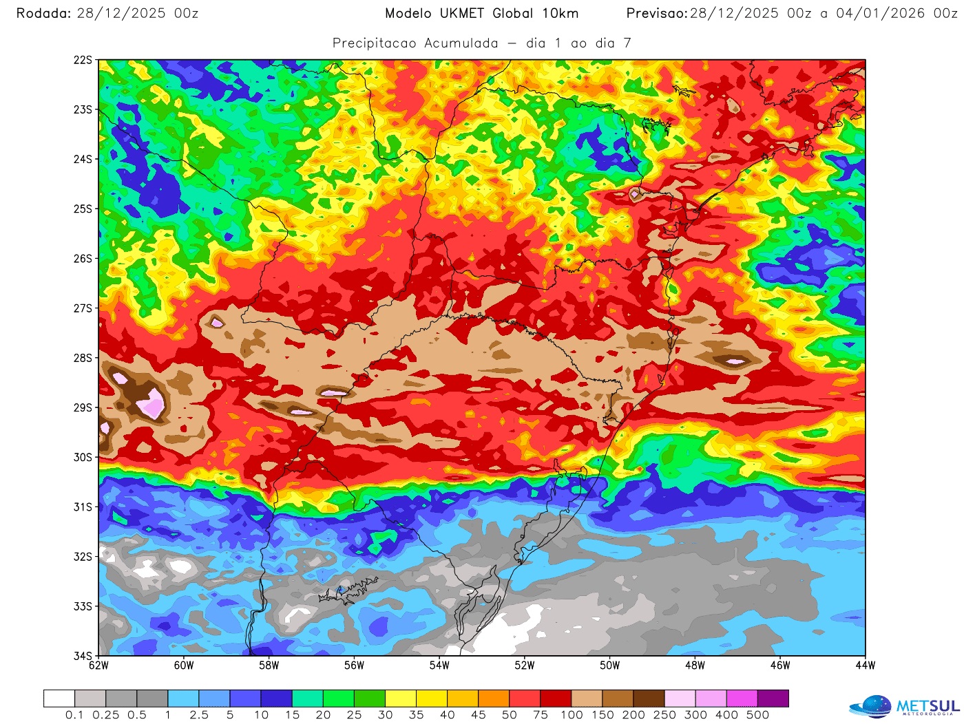 O padrão não muda muito neste últimos dias do ano e no começo de 2026 à medida que ar tropical quente e úmido permanece sobre o Sul do Brasil. Com ar tropical, ficará favorecida a ocorrência de convecção com chuva localmente forte e temporais isolados com chuva, raios e rajadas de vento forte.