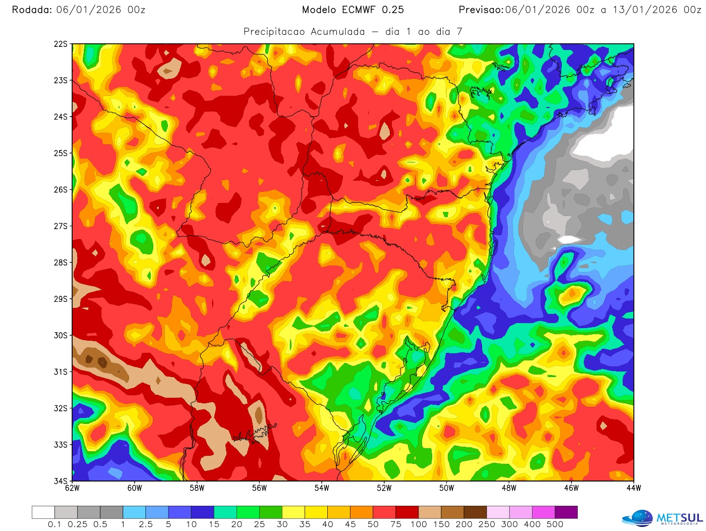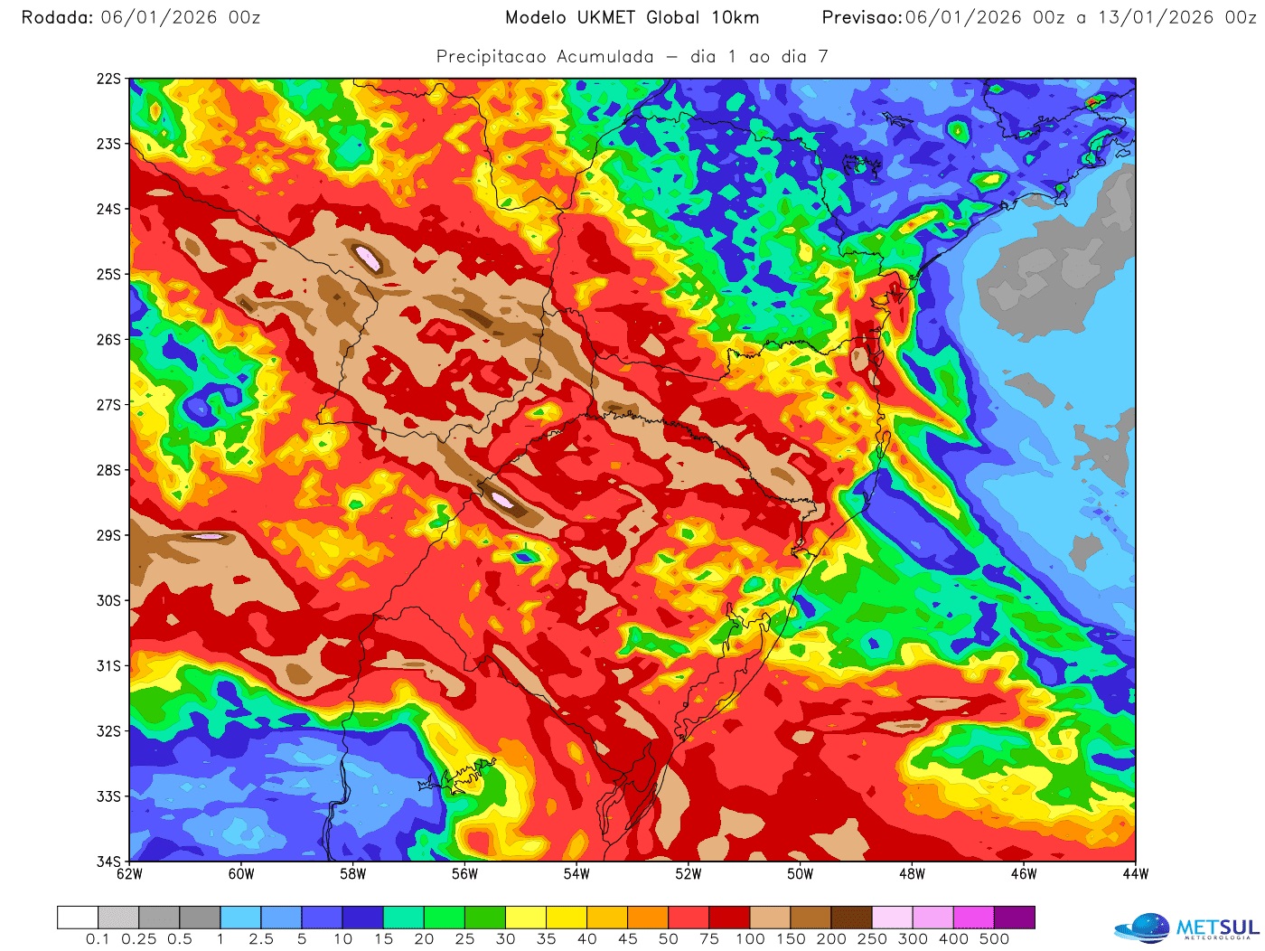 Os mapas a seguir mostram as projeções de chuva dos modelos do Centro Meteorológico Europeu (ECMWF) e do modelo UKMET do Met Office do Reino Unido até o começo da semana que vem no Sul do Brasil.
