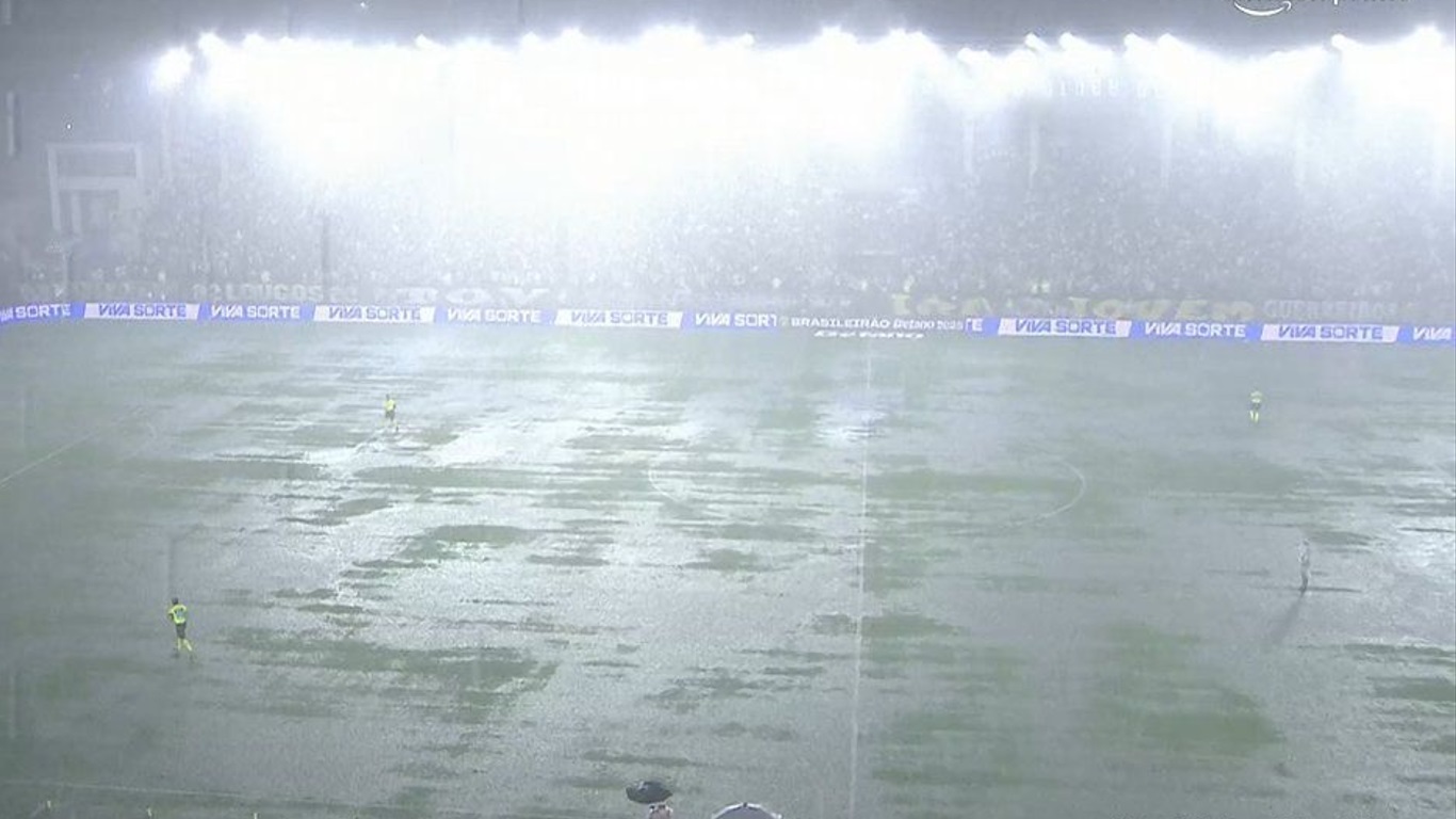 Gramado do estádio São Janauário ficou alagado com a chuva intensa | AMAZON PRIME/REPRODUÇÃO