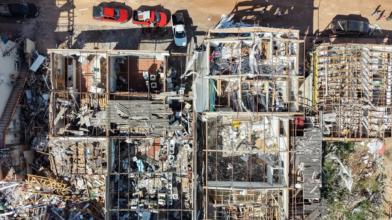Em tornado, as conexões por pregos e parafusos leves se rompem facilmente, permitindo que o vento levante o telhado ou derrube paredes inteiras. Muitas casas não têm o que engenheiros chamam de “caminho contínuo de carga”, ou seja, um sistema de amarração que transfere as forças do vento do telhado até a base da estrutura. Assim, quando o telhado se desprende, o colapso das paredes ocorre em seguida.