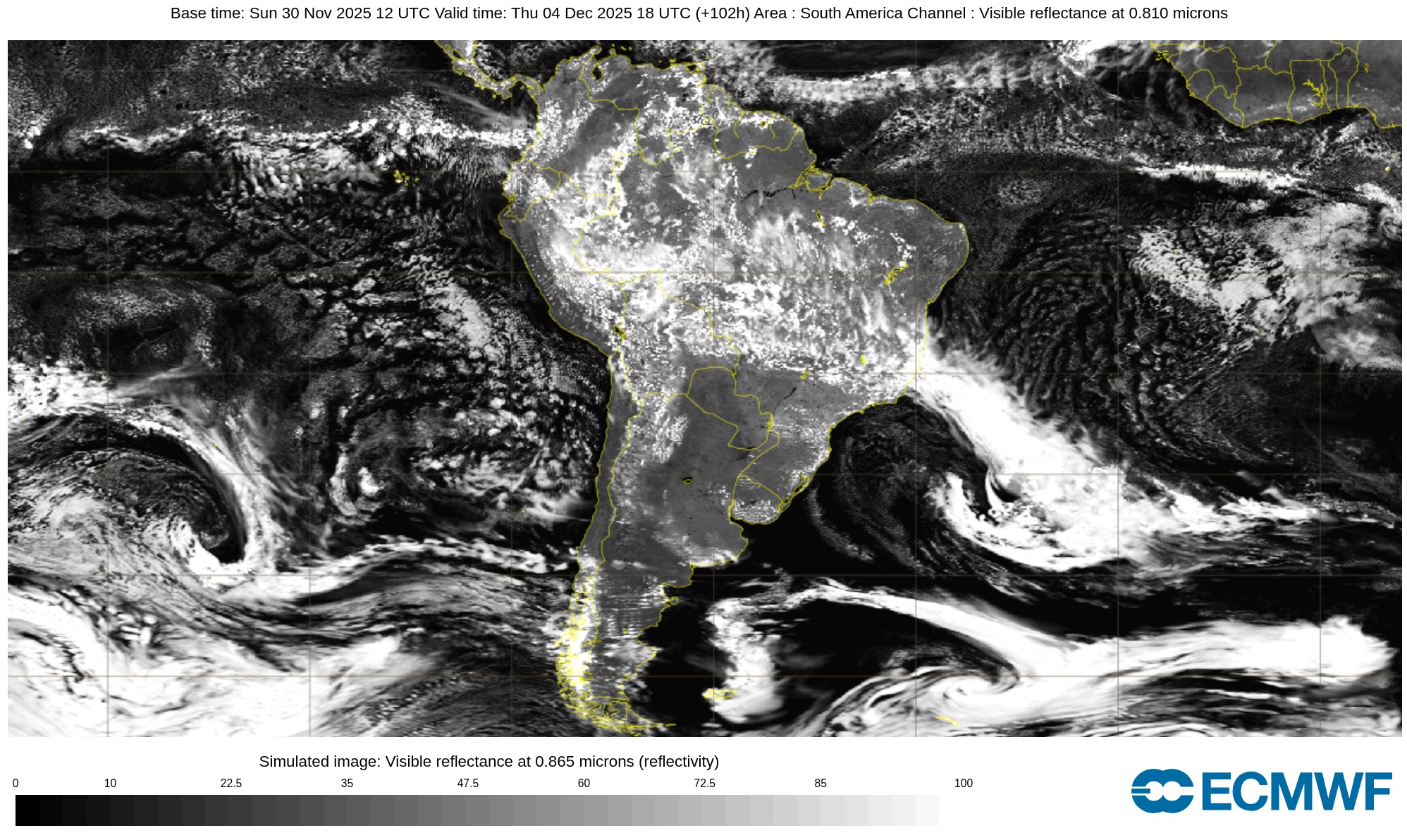 O mapa a seguir mostra a projeção de nebulosidade do modelo do Centro Meteorológico Europeu para o meio-dia de quinta-feira (4) em que se observa a espiral clássica de nuvens de um ciclone bastante longe do continente sobre o oceano e uma frente fria associada ao ciclone se estendendo até o Espírito Santo e o Sul da Bahia.