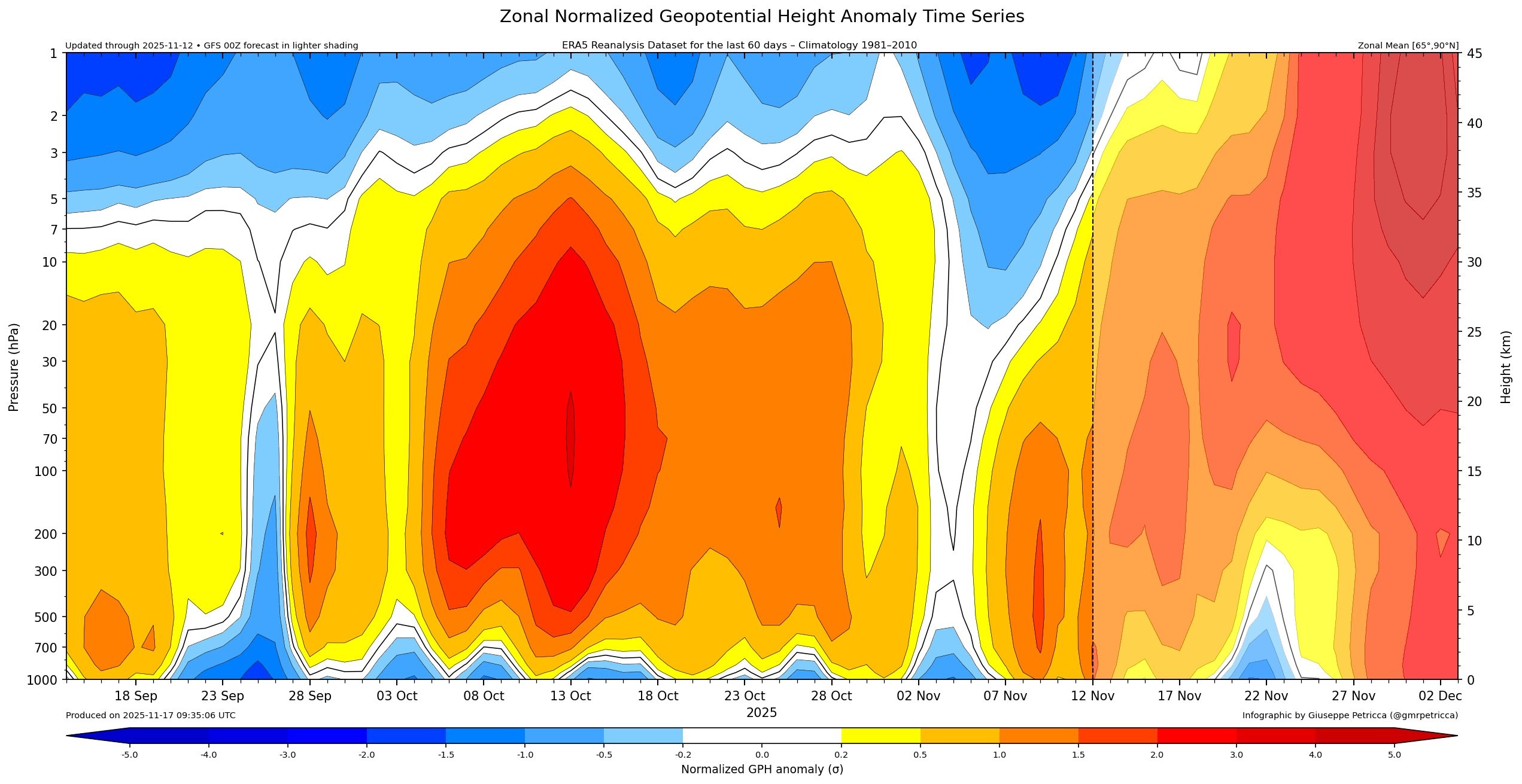 Neste ano, o aquecimento estratosférico ocorre de forma incomum e muito antecipada, algo observado apenas algumas vezes nos últimos 70 anos. Os modelos de previsão mostram que o aquecimento começará de forma mais intensa nos próximos dias.