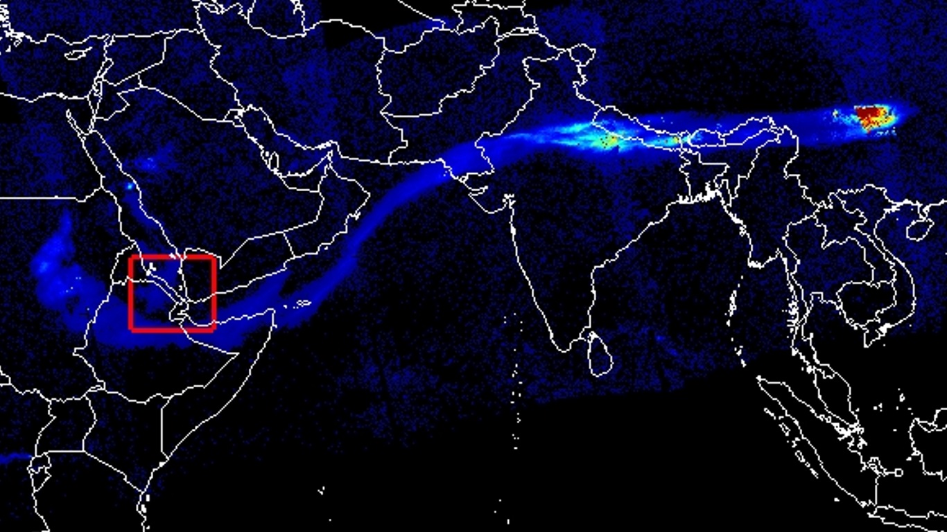 A pluma seguiu impulsionada por ventos fortes em altitude e cruzou o Mar Vermelho poucas horas após o início da erupção. Em seguida, espalhou-se sobre partes da Península Arábica antes de seguir rumo ao subcontinente indiano. Segundo o Departamento Meteorológico da Índia (IMD), a nuvem atingiu altitudes entre 8,5 km e 15 km, faixa crítica para o tráfego aéreo internacional.